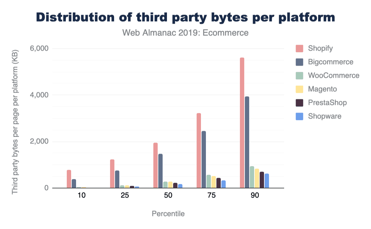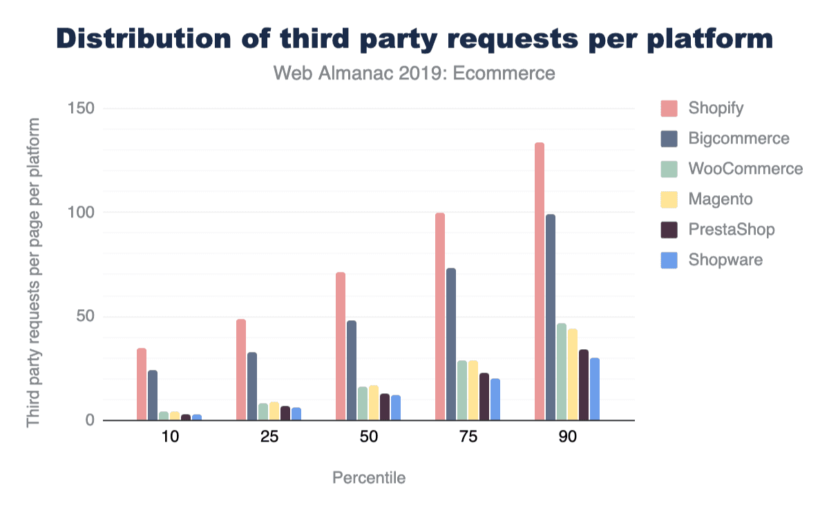 Platforms such as Shopify may extend their services using client-side JavaScript, whereas other platforms such as Magento use more server side extensions. This difference in architecture affects the figures seen here.