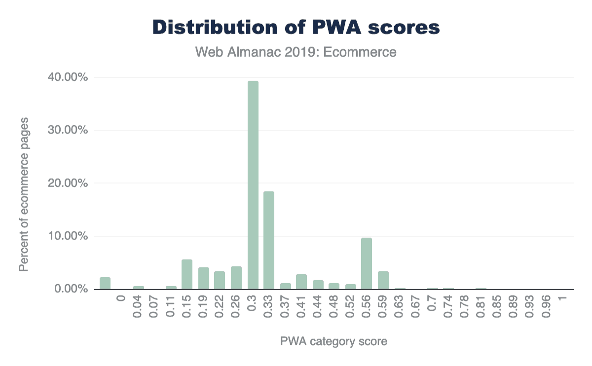 More than 60% of home pages on ecommerce platforms get a Lighthouse PWA score between 0.25 and 0.35. Less than 20% of home pages on ecommerce platforms get a score of more than 0.5 and less than 1% of home pages score more than 0.6.