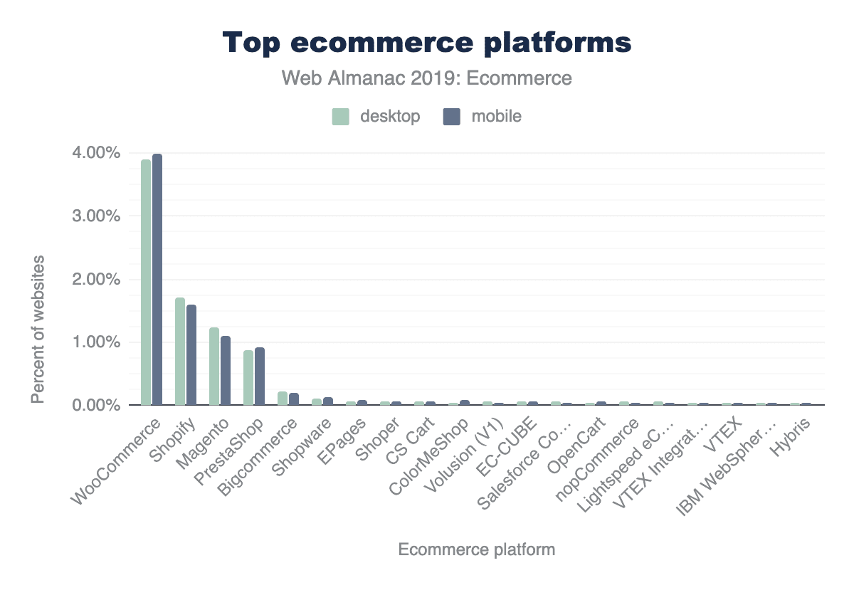 Out of the 116 ecommerce platforms that were detected, only six are found on more than 0.1% of desktop or mobile websites. Note that these results do not show variation by country, by size of site, or other similar metrics.