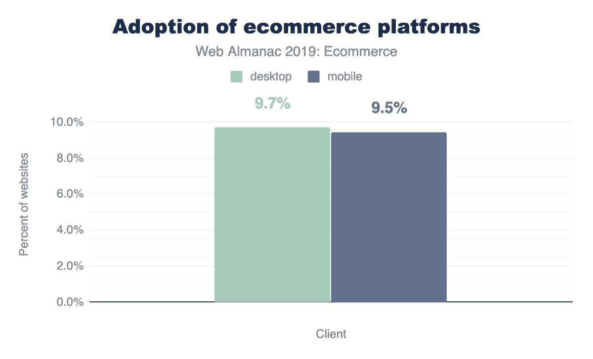 In total, 9.7% of desktop pages and 9.5% of mobile pages used an ecommerce platform.