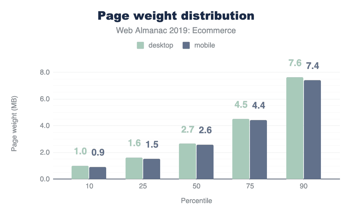 The median (’mid-range’) home page on an ecommerce platform makes 17 requests for third-party content on mobile and 19 on desktop. 10% of all home pages on ecommerce platforms make over 50 requests for third-party content, with a total payload of over 1 MB.