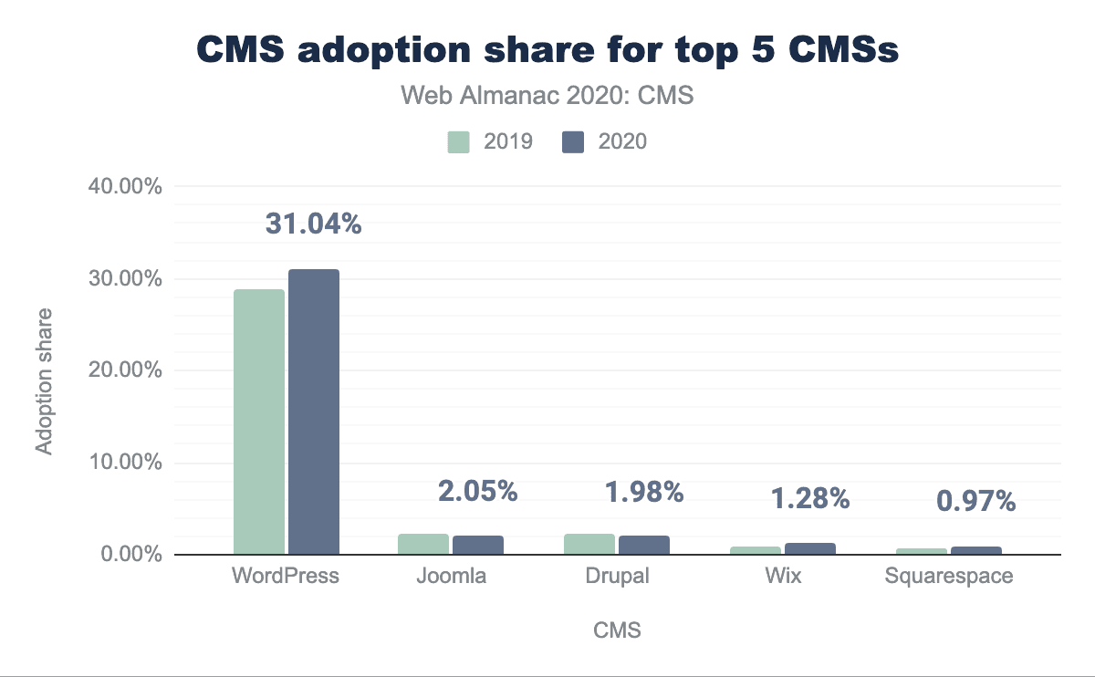 The one CMS with a share over 2% is WordPress, which has a 31% usage share. This is over 15 times the share of the next most popular CMS, Joomla: