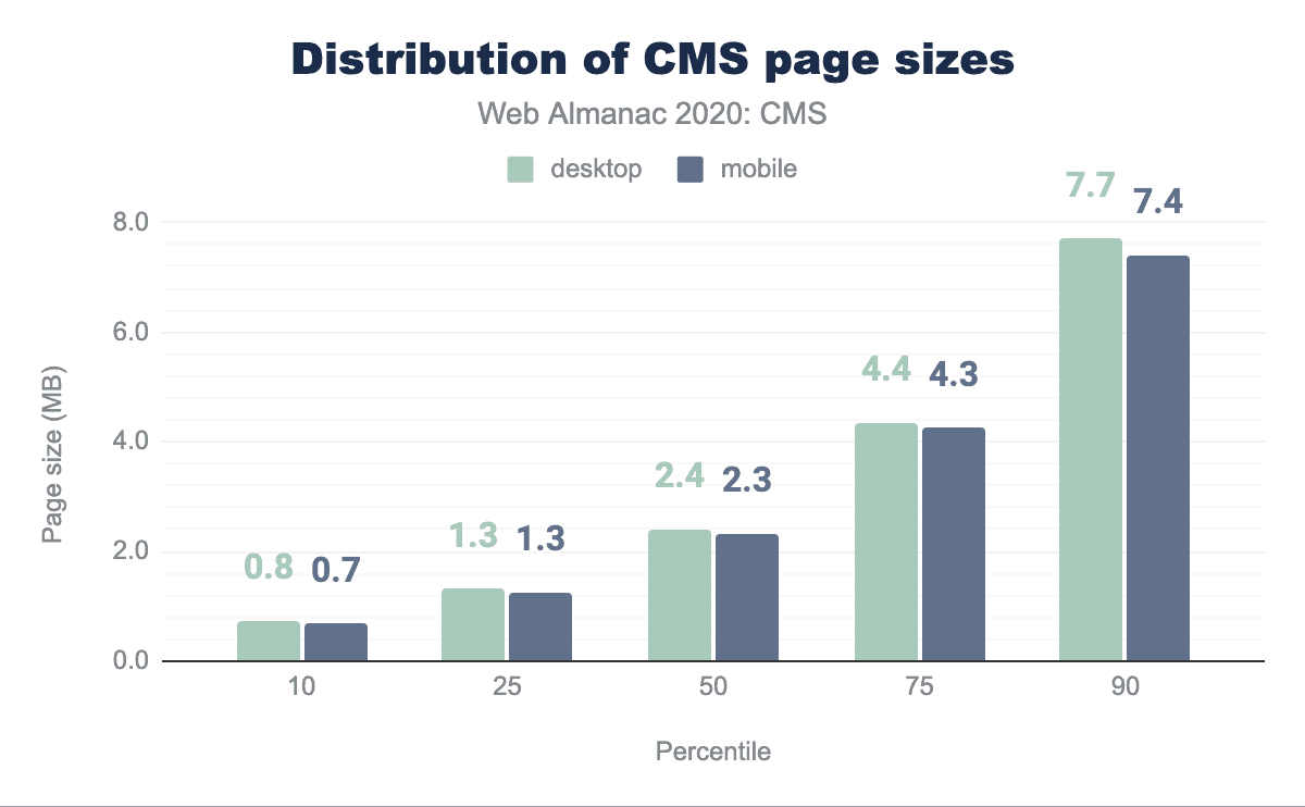 Page weights are important here. The average desktop CMS web page loads 2.4 MB of HTML, CSS, JavaScript, media, etc. 10% of pages, however, load over 7 MB of this data. On mobile devices the average web page loads 0.1 MB fewer than on desktop, with at least this number being true across all percentiles: