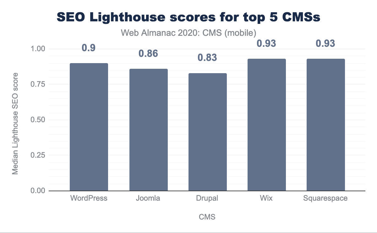 All of the top 5 CMSs score highly here with median scores of 0.83 or above, with some reaching as high as 0.93. SEO can depend on the website owner making use of capabilities of a CMS but making those options easy to use in a CMS, and good defaults, can have big benefits for sites run on those CMSs.