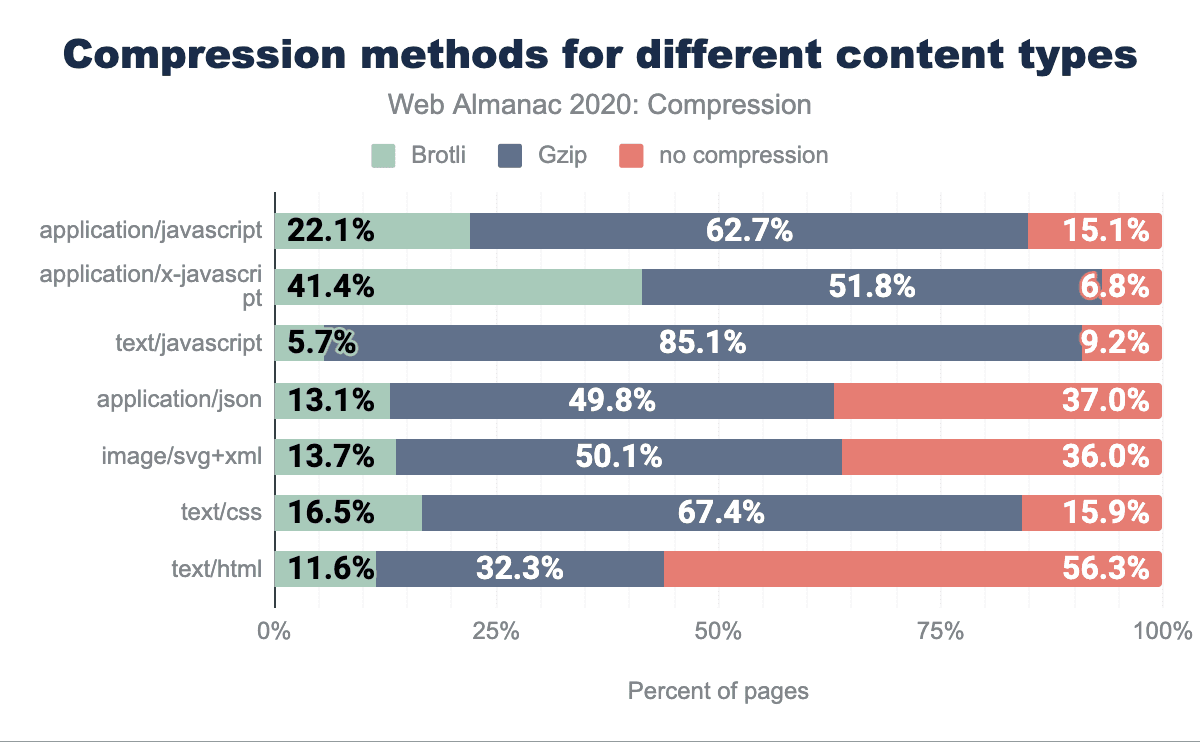 Text compression is widely used for the relevant formats, although there is still a significant percentage of HTTP responses that could benefit from additional compression. You can profit from taking a close look at the configuration of your server and set compression methods and levels to your need. A great impact for a more positive user experience could be made by carefully choosing defaults for the most popular HTTP servers.