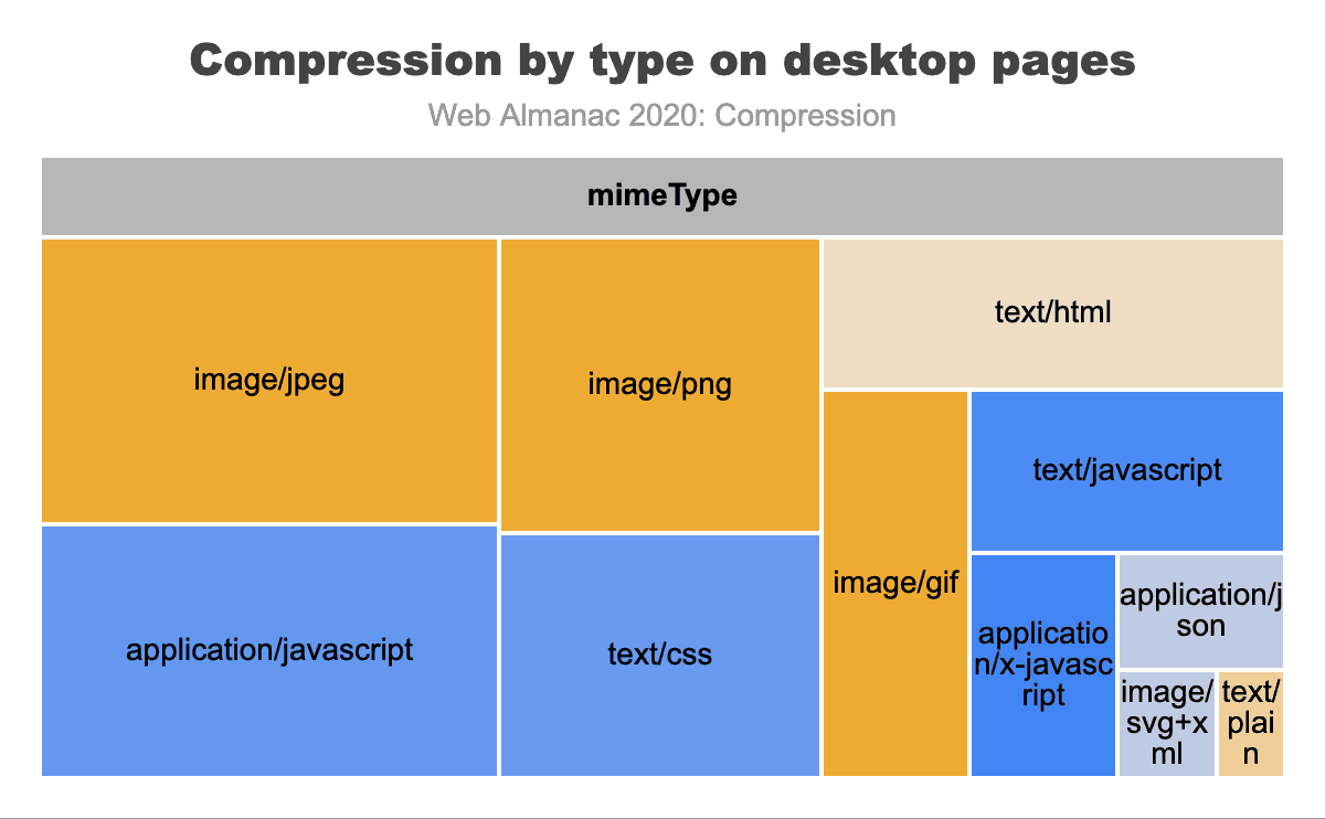 In the graph below, the top 11 content types are displayed with box sizes representing the relative number of responses. The color of each box represents how many of these resources were served compressed, orange indicates a low percentage of compression while blue indicates a high percentage of compression. Most of the media content is shaded orange, which is expected since Gzip and Brotli would have little to no benefit for them. Most of the text content is shaded blue to indicate that they are being compressed. However, the light blue shading for some content types indicate that they are not compressed as consistently as the others.