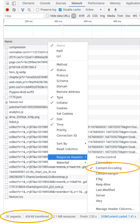 You can use Firefox Developer Tools or Chrome DevTools to quickly figure out what content a website already compresses. To do this, go to the Network tab, right click and activate “Content Encoding” under Response Headers. Hovering over the size of individual files you will see “transferred over network” and “resource size”. Aggregated for the entire site one can see size/transferred size for Firefox and “transferred” and “resources” for Chrome on the bottom left hand side of the Network tab.