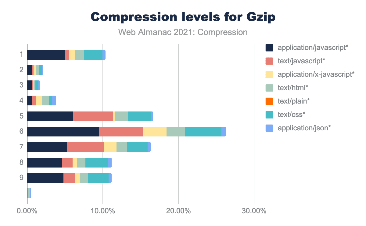 The figure breaks down each compression level by content type. JavaScript is the most common content type in almost all cases. For Brotli, the proportion of JavaScript in the highest compression levels is higher than in the lower compression levels, while JSON is more common in the lower compression levels. For Gzip, the distribution of the JavaScript content type is roughly equal at all levels.