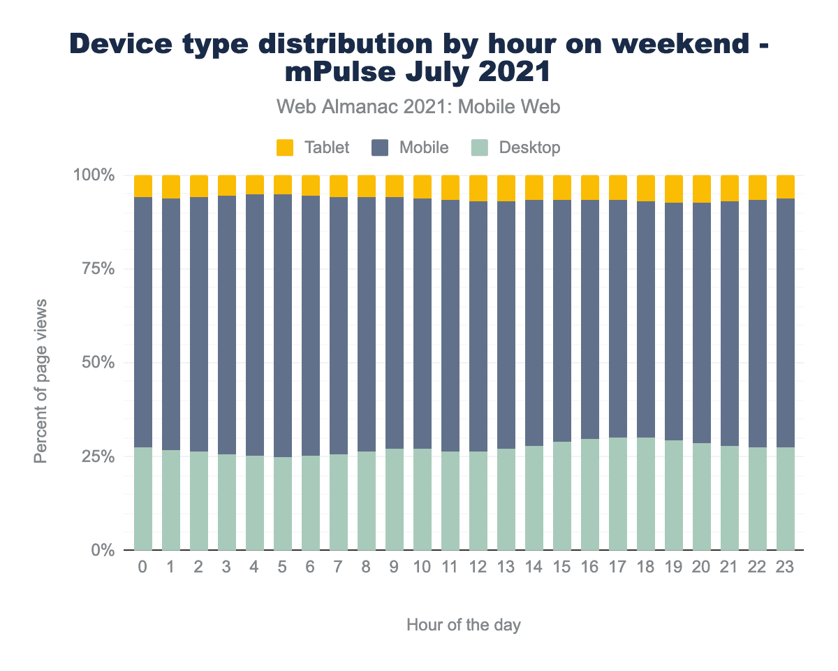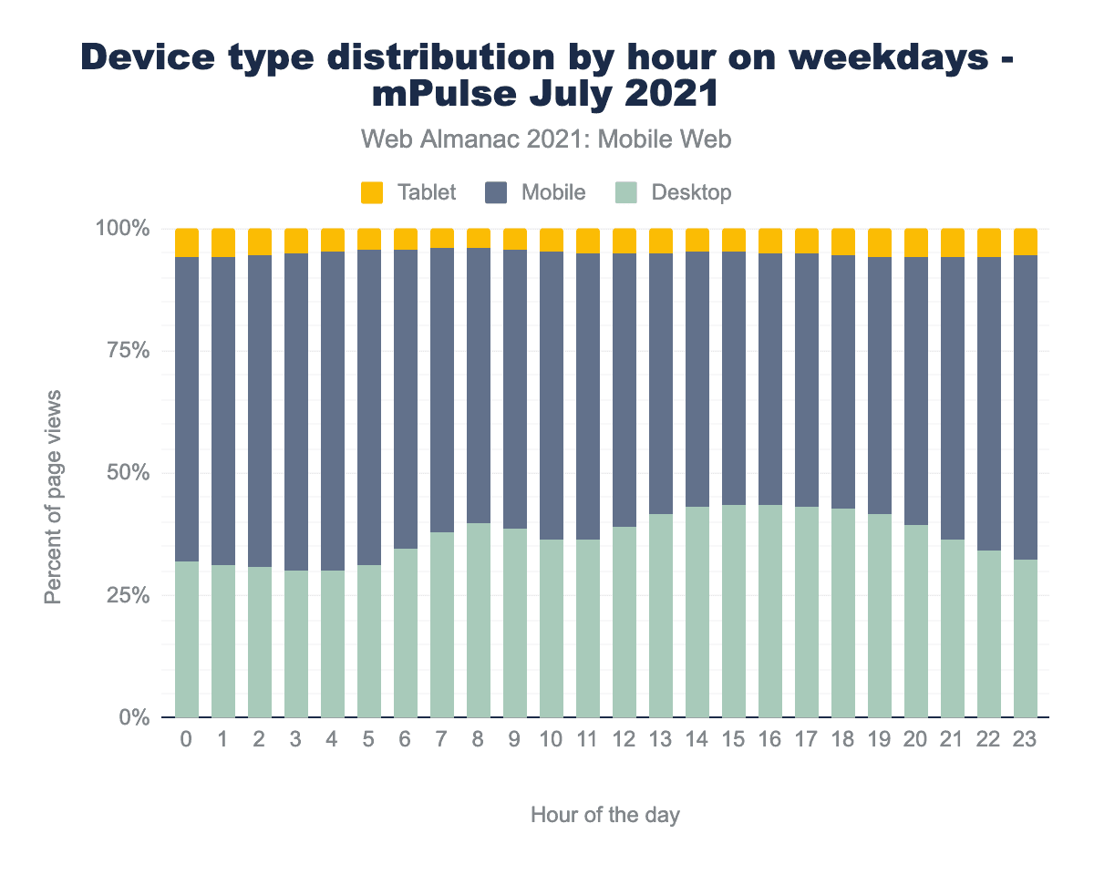 Fortunately, there are a few other sources. Paul Calvano ran some analysis on the Akamai mPulse real user monitoring data for July 2021. It found a slightly more even match between Mobile and Desktop traffic, at 59.4% being from mobile devices. The mPulse data is aggregated hourly, so it reveals some interesting trends