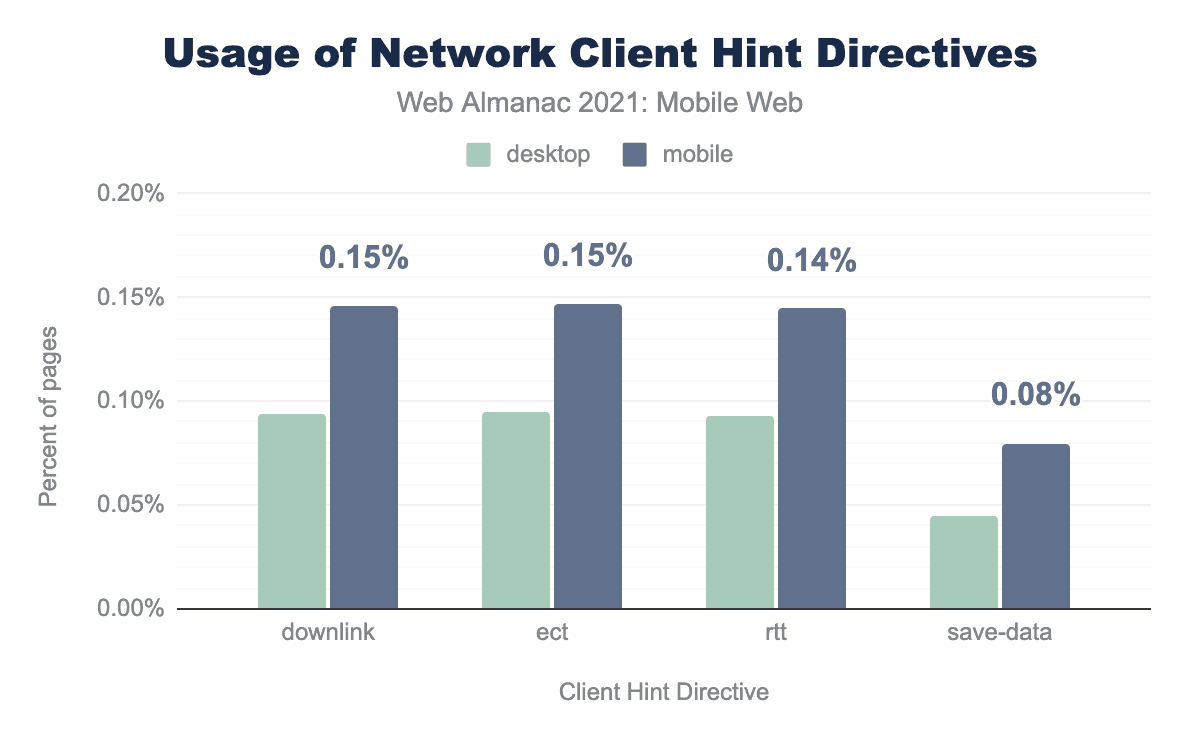 save-data being used less by both at 0.04% and 0.08% respectively.Network Client Hints show a similar uptake to Device Client Hints, with Downlink and ECT (effective connection type) being requested by 0.2% of loads on mobile, and RTT (round trip time) on 0.1% of loads on mobile.