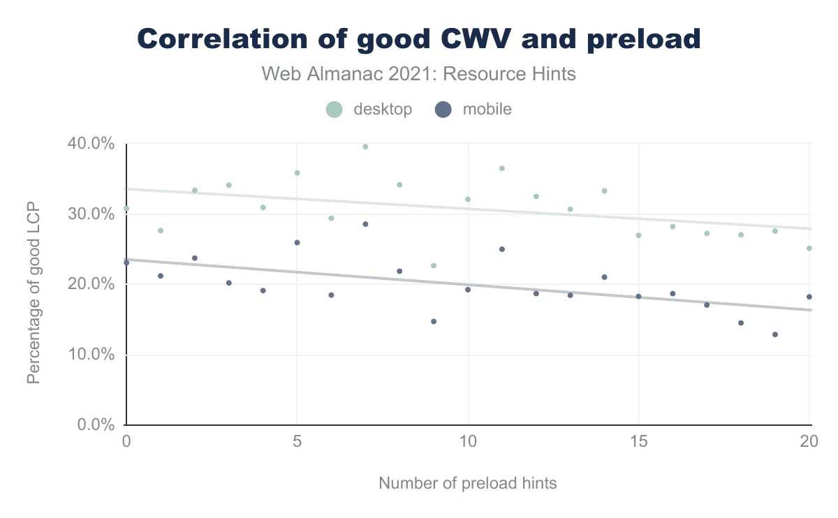 rel="preload" hints on that page. 30.8% of desktop pages, and 23.0% of mobile pages with 0 preload hints have a good CWV score. 25.1% of desktop pages and 18.2% of mobiles page, with 20 preload hints have a good CWV score.rel="preload" hints
