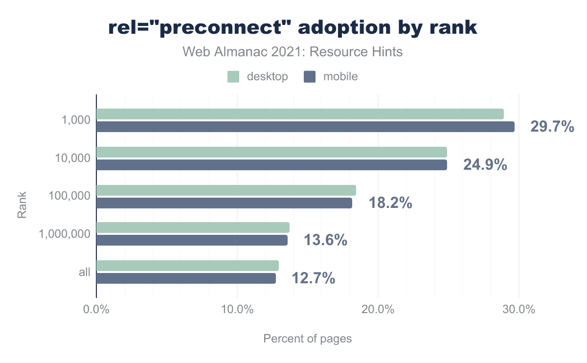 rel="preconnect" segmented by CrUX rank. rel="preconnect" has a 29.7% for the top 1,000 sites on mobile and 29.0% on desktop. rel="preconnect" has a 24.9% for the top 10,000 sites on mobile and 24.9% on desktop. rel="preconnect" has a 18.2% for the top 100,000 sites on mobile and 18.4% on desktop. rel="preconnect" has a 13.6% for the top 1 million sites on mobile and 13.7% on desktop. rel="preconnect" has a 12.7% for all sites on mobile and 12.9% on desktop.rel="preconnect" segmented by CrUX rank.