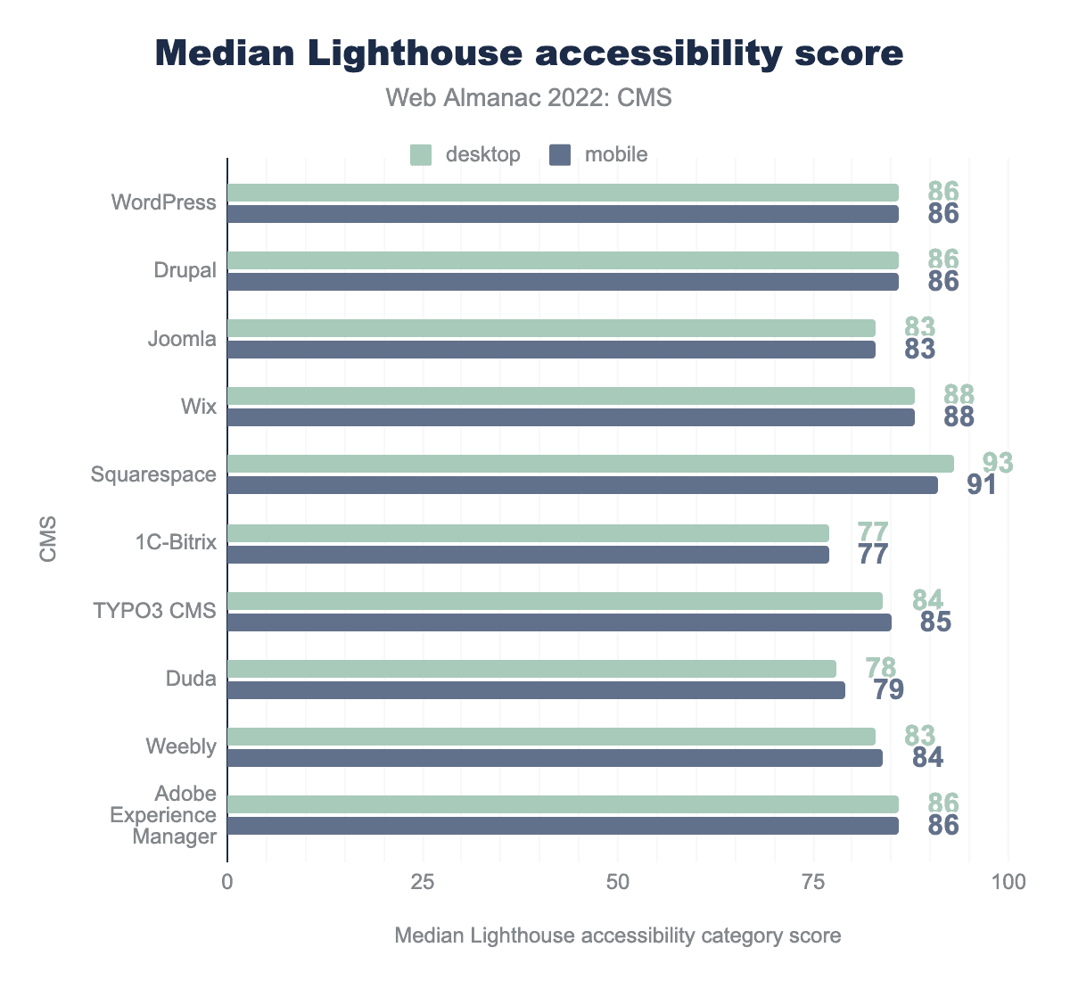 The median Lighthouse accessibility score for the top 10 CMSs ranges between 77 and 91. Squarespace had the highest score of 91, while 1C-Bitrix had the lowest accessibility scores. The desktop scores are almost identical to mobile, perhaps reflecting that the same sites are delivered to both desktop and mobile devices.