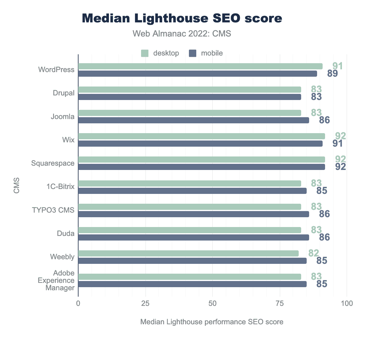 The median SEO scores in all of the top 10 platforms range from 83-92, a slight reduction from 84-95 in 2021. Desktop scores are similar—slightly better in some cases, slightly worse in others.