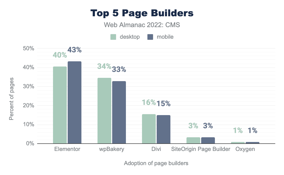 Now that we’re tracking page builder data, we’ll have the opportunity in future editions to evaluate year-over-year changes in page builder adoption and look for correlations in those changes to the overall performance of WordPress as a CMS.