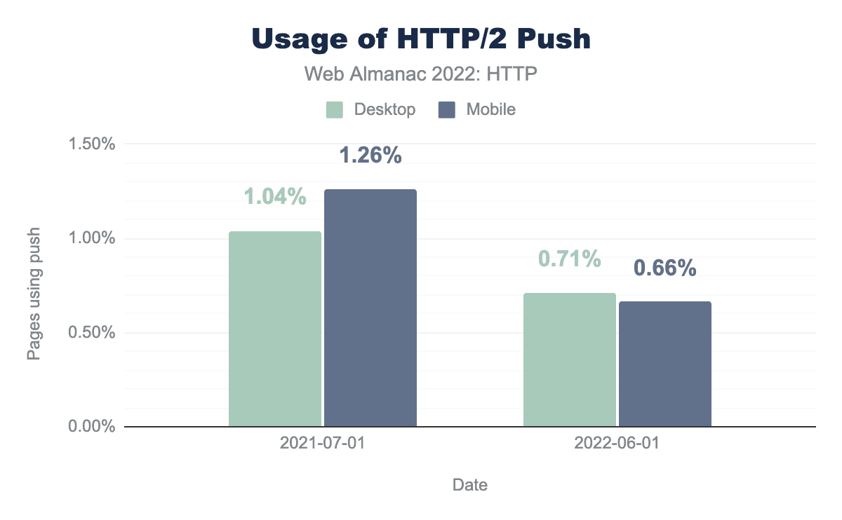 With the difficulties, Chrome decided to deprecate HTTP/2 Push starting from Chrome version 106. Despite push officially still being a part of the HTTP/3 standard, Chrome—which the HTTP Archive crawler uses—never implemented push for HTTP/3 connections, which might further explain the reduction in usage as sites moved to that version and lost the ability to push.