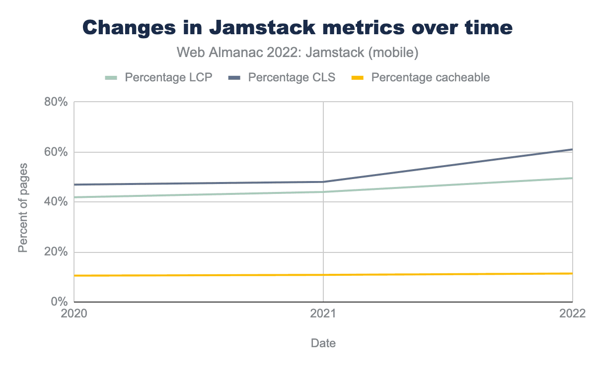 Applying our new criteria, we measured what percentage of sites in the HTTP Archive qualify as “Jamstack”. Because the measures we used in 2020 and 2021 were very different, we also went back and re-measured those samples using the 2022 definitions.