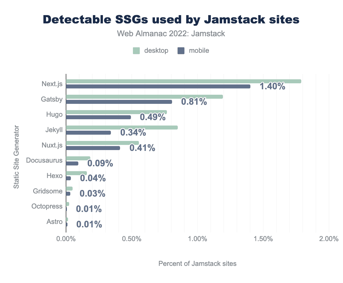 Despite all these caveats, we think this year’s estimate of “Jamstack-y” sites is an improvement over a strictly SSG-focused definition and gives a better sense of where the web really is today, which is after all the goal of the Almanac.