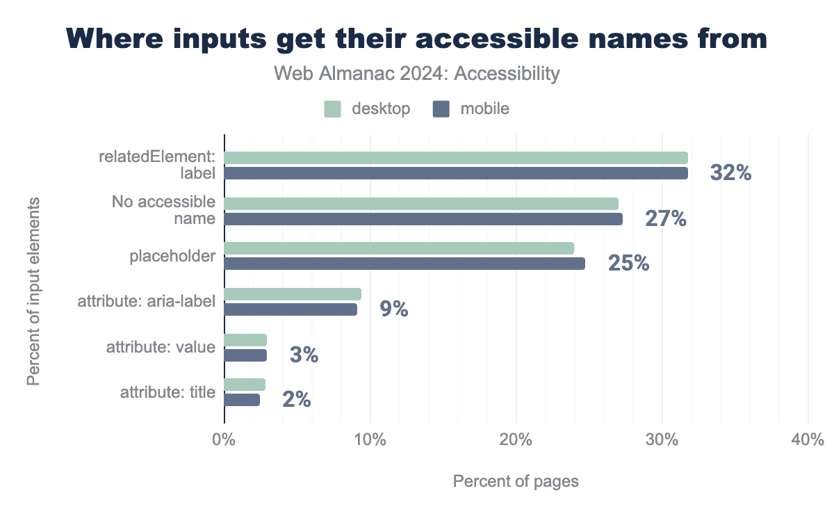 We discovered that 53% of websites apply :focus {outline: 0} (in 2022 it was 86%), which removes the default outline provided by browsers for focused interactive elements. Although some websites implement custom styles to override this, it’s not always the case, making it challenging for users to identify the currently focused element and impeding navigation. Sara Soueidan offers valuable guidance on designing WCAG-compliant focus indicators. On a positive note, 12% of websites now use :focus-visible (up from 9% in 2022 and 0.6% in 2021), which is a pseudo class that uses browser heuristics to determine when to show the focus indicator. This is a significant improvement in accessibility practices.
