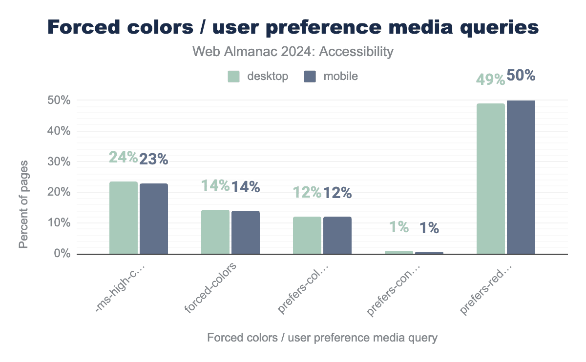 Support for forced-contrast increased about 4% in 2024 to 14% for desktop. Forced Colors Mode is an accessibility feature designed to enhance text readability through improved color contrast. When activated, the user’s operating system takes control of most color-related styles, overriding website color settings. This mode disables common patterns like background images to ensure more predictable text-to-background contrast.