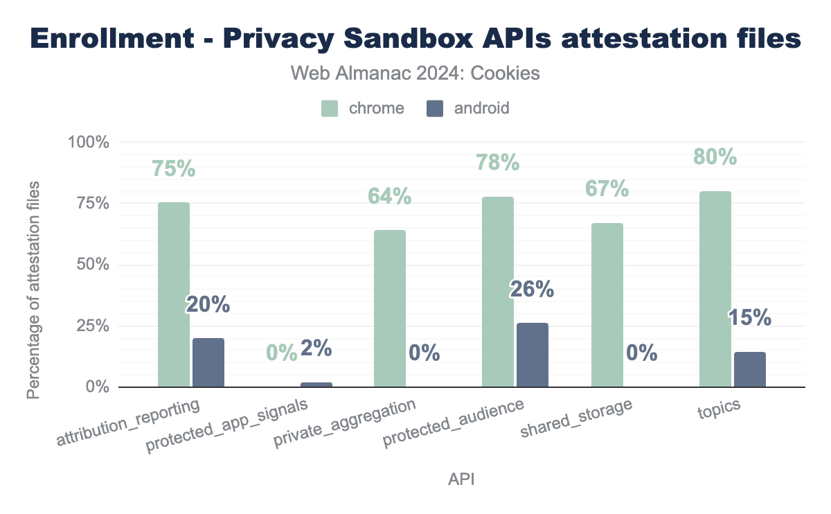 We used a custom crawler separate from the HTTP Archive tools to obtain and parse these attestation files. We successfully retrieved attestation files for 232 distinct domains with that crawler (some attestation files may be available but not obtained by this crawler due to networking issues for example). Next, we report the proportion of domains that are enrolled for each API on Chrome and Android. We observe that the majority of these origins are enrolled to call one of the five Chrome APIs requiring an attestation while the proportion is way less for the Android APIs.