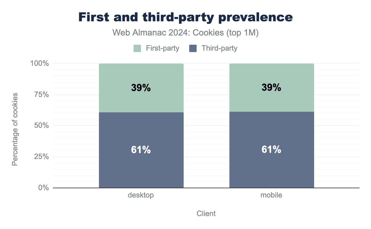 On the top one million most visited websites, about 39% of the cookies are first-party and 61% are third-party cookies. Thus, a majority of the cookies set on the web are third-party cookies. We also observe that this distribution is very similar whether these websites are accessed through a desktop or a mobile client. This indicates that overall there is little to no behavior change based on the type of client used. However, some websites may still behave differently and/or use other tracking methods such as fingerprinting depending on the type of client (see the Privacy chapter for more).