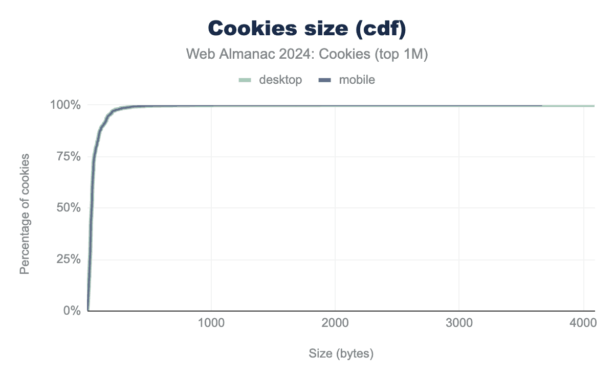 This section focuses on the actual size of these cookies. We find that the median size across all cookies observed on desktop during the HTTP Archive crawl of June 2024 is 37 bytes. This median value is consistent across first and third-party cookies as well as clients. The maximal size that we obtain is at about 4K bytes which is consistent with the limits defined in RFC 6265. Note that because of the way the HTTP Archive tools work and collect the cookies, if websites try to set cookies larger than the limit of 4K bytes this information would be missing from the data analyzed in this chapter.
