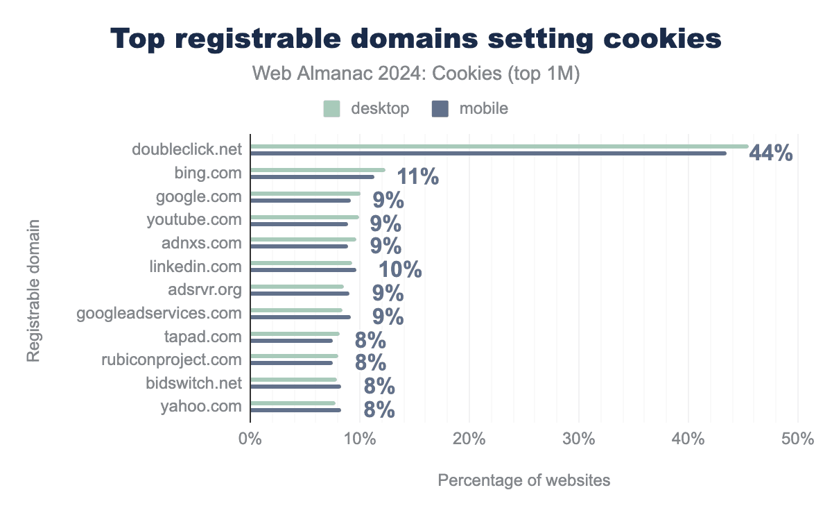 Third-party cookies also predominantly set by Google: doubleclick.net sets a cookie on 44% of websites. Other top trackers have a considerably smaller reach of 8-12% of websites. In general, the most popular third-party cookies belong predominantly to the targeted advertising category.