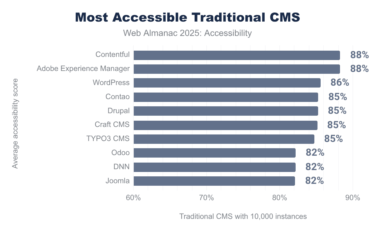Among traditional CMSs, Sitecore maintained 85% accessibility in 2025, though its instance count dropped below 10,000. Adobe Experience Manager (AEM) and Contentful continue to lead, likely because larger corporations adopting these enterprise solutions have more resources to address accessibility issues. WordPress showed no significant improvement from 2024, but rose to third place, reflecting its market dominance and the growing accessibility consciousness of its user base.