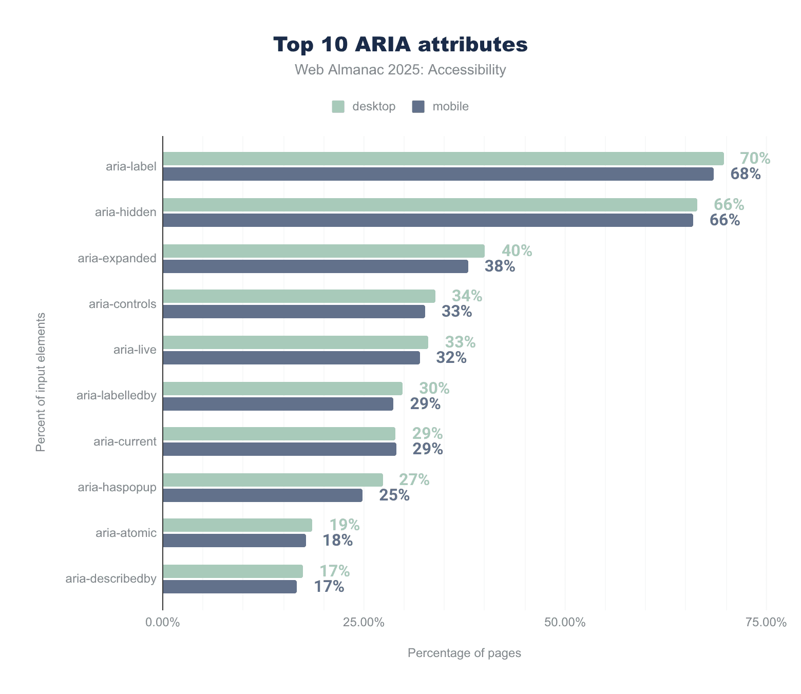 In 2025, the adoption of ARIA landmarks has increased slightly, led by the growing use of the native <main> element, now at 47%, up 3% from 2024. This progress reflects better compliance with semantic HTML and more robust page structure for users relying on assistive tools.