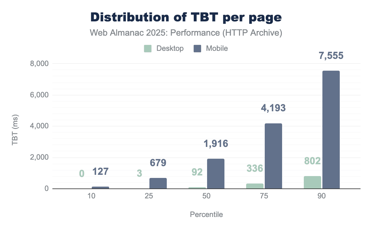 The median TBT on mobile increased to 1,916 milliseconds in 2025—up 58% from 1,209 milliseconds in 2024. Desktop TBT also rose from 67 milliseconds to 92 milliseconds. At the 90th percentile, mobile users now face over 7.5 seconds of blocking time before the page becomes fully interactive.
