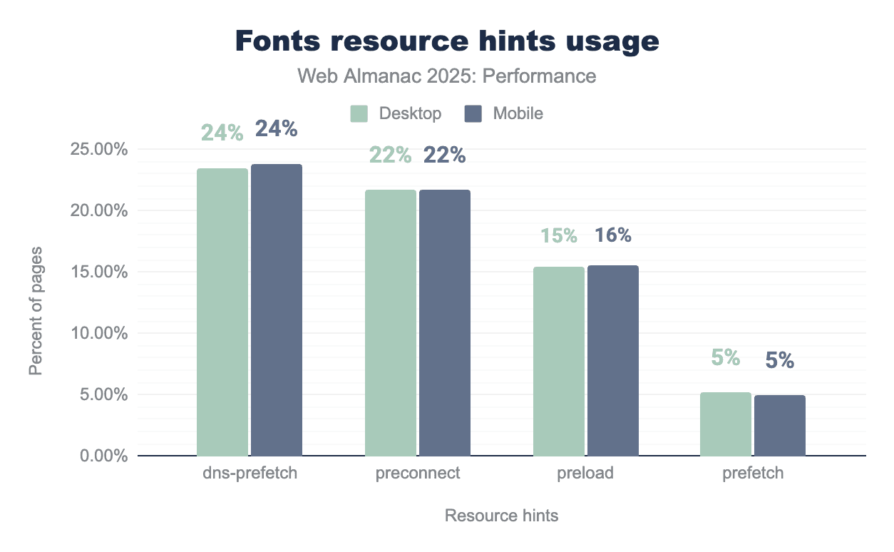 dns-prefetch is the most commonly used hint, appearing on 24% of pages on both desktop and mobile, followed by preconnect at 22% on each device. preload is used less frequently at 15% on desktop and 16% on mobile, while prefetch remains rare at around 5% on both platforms.Font resource hint usage is very similar across desktop and mobile. About 24% of pages use dns-prefetch and 22% use preconnect, which mainly helps in reducing connection setup time. Preload is a good way to make fonts available early during rendering but is used on only 15-16% of pages. Even fewer pages, around 5%, use prefetch, which is generally less useful for fonts needed during the initial page load. This suggests there is substantial opportunity to improve font performance through more targeted use of resource hints.