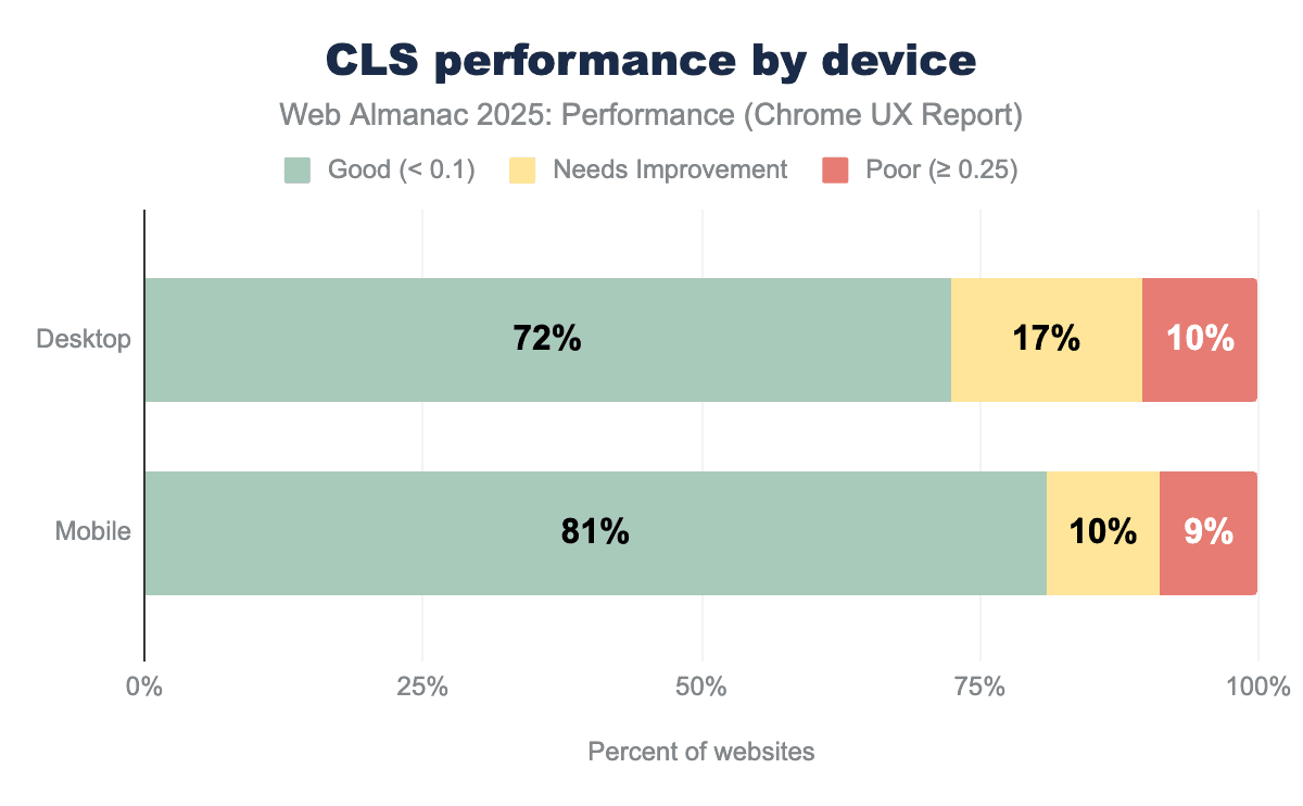 In 2025, 72% of desktop pages and 81% of mobile pages achieve a “good” Cumulative Layout Shift (CLS) score. Desktop pages show a higher share of “needs improvement” CLS (17%) compared to mobile (10%), while the proportion of pages with “poor” CLS is similar across devices at around 9-10%. This shows that most pages are close to meeting the CLS threshold, with fewer pages experiencing severe layout instability.