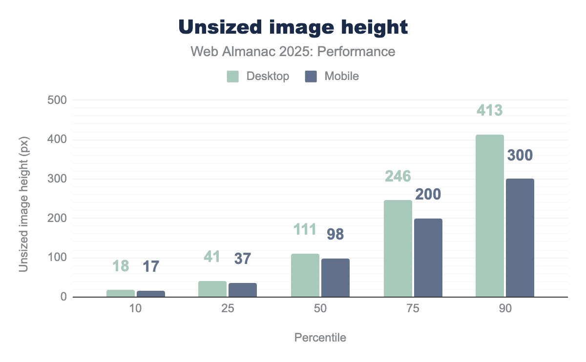 Unsized images are much taller at higher percentiles. At the median, unsized images are about 100px tall on both desktop and mobile, but by the 90th percentile they grow to around 413px on desktop and 300px on mobile. Taller unsized images increase CLS because they cause larger vertical layout shifts when they load, especially if they appear in the viewport. Since web pages scroll vertically, missing image height has a much bigger impact on CLS than missing width.